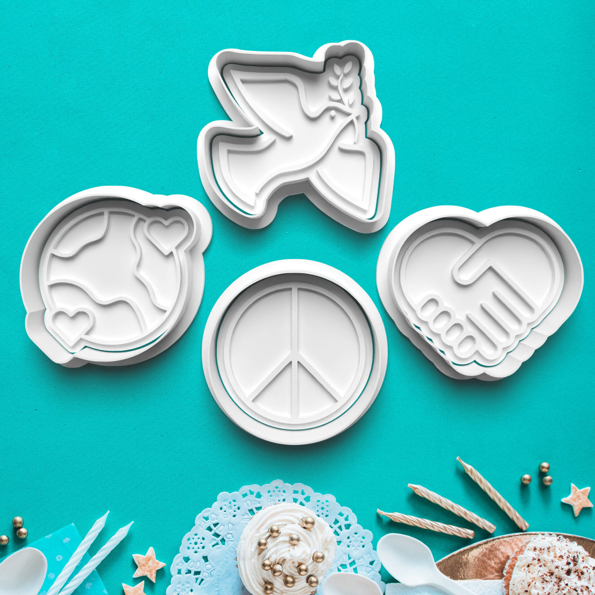 Vykrajovačky Mier Sada 4ks vykrajovačiek s pečiatkou o rozmere cca: Dĺžka: 6-7 cm Šírka: 6-7 cm
